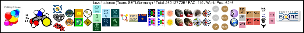 | Seti@home | [AF>Le_Pommier>MacBidouille.com]Prof | 20056 | 5 267 405 | 0 | L'Alliance Francophone | 150 | France | 457 |